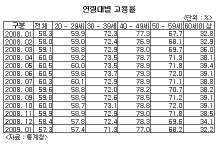 Áö³ 1¿ù Àüü °í¿ë·üÀº 57.3%·Î Áö³ 2001³â 2¿ùÀÇ 56.1% ÀÌÈÄ °¡Àå ³·¾ÒÁö¸¸ 20´ëó·³ ÃÖ¾ÇÀ¸·Î Ä¡´ÝÁö´Â ¾Ê¾Ò´Ù.